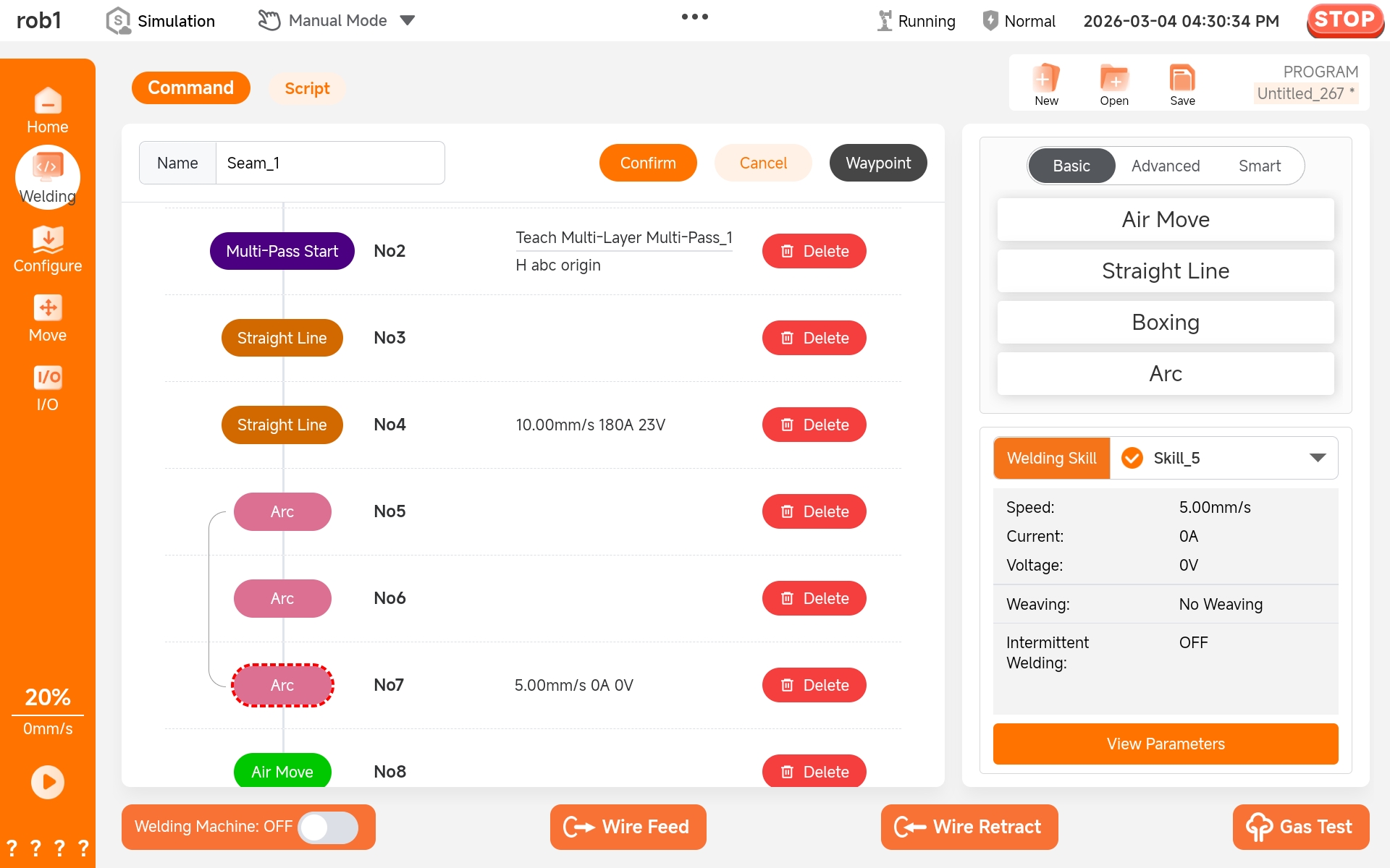 Once the welding project is established, the original track simulation and rapid simulation can be used to check whether the robot arm runs according to the user's expected track. First, click [Confirm] to activate the welding project. (The welding project will not take effect unless confirmed.)