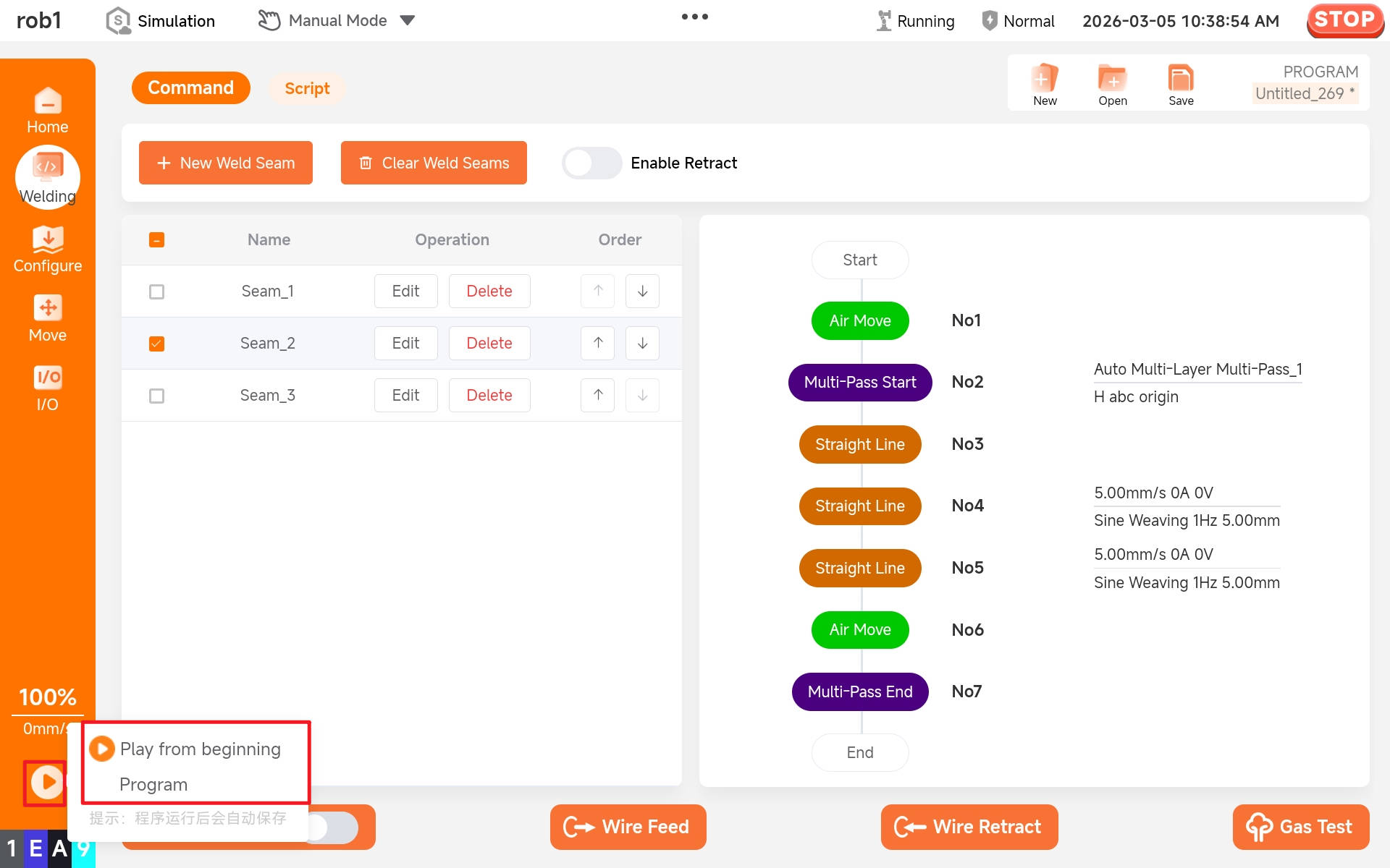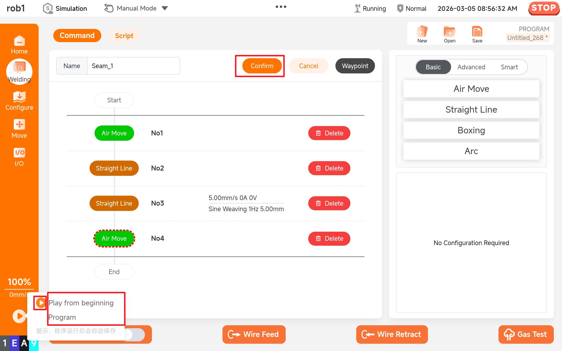 After editing the project, click the buttons in sequence: "Confirm > Play > Play from beginning Program" to run the weld.