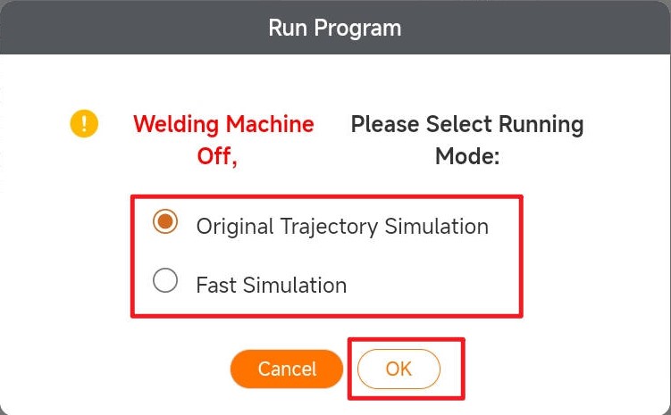 First, select original track simulation/fast simulation. If the [Fast Simulation] is selected, the robot arm will simulate the weld program track using motion parameters. If the [Original Track Simulation] is selected, the robot arm will simulate the weld program track using process parameters.