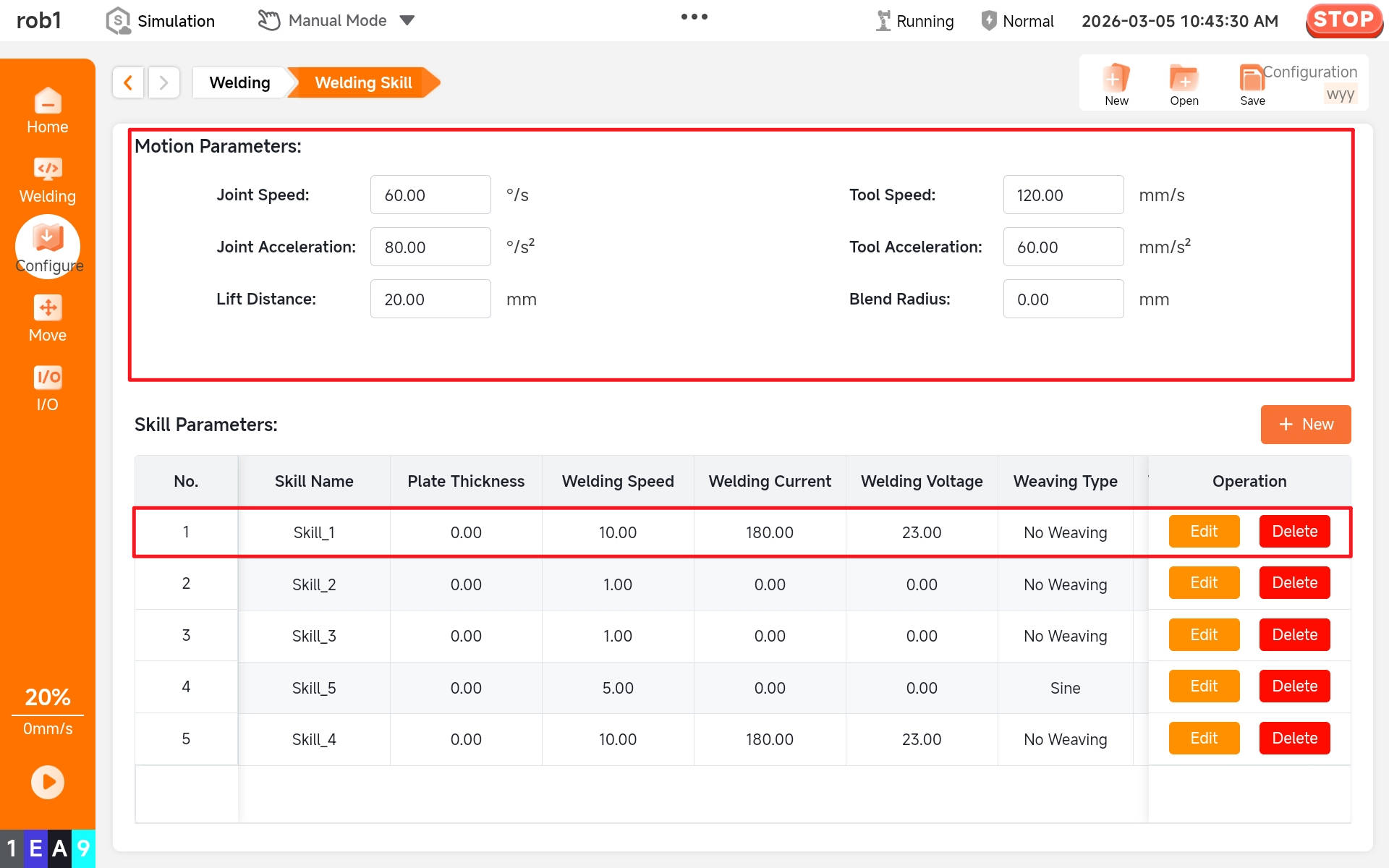 - Global motion parameters: These are the motion parameters of the robot's preparatory actions before and after the welding action.