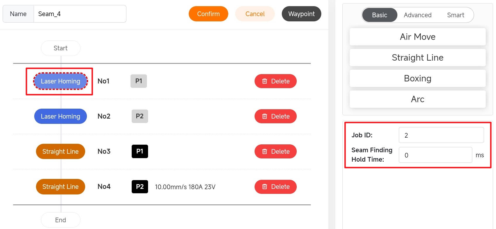 Seam Finding Hold time: The duration that the robot arm stays at the positioning point when laser positioning is used, measured in milliseconds.