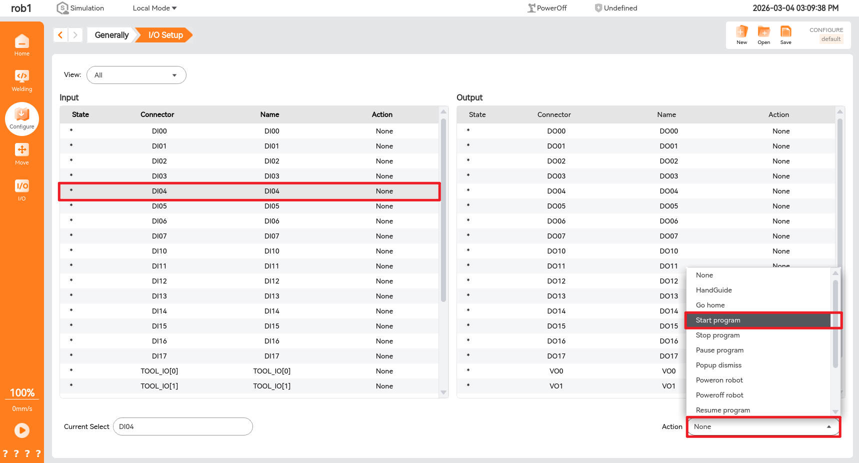 Click the [Configure] shown below, and then select [I/O Setup] to enter the I/O setup interface.