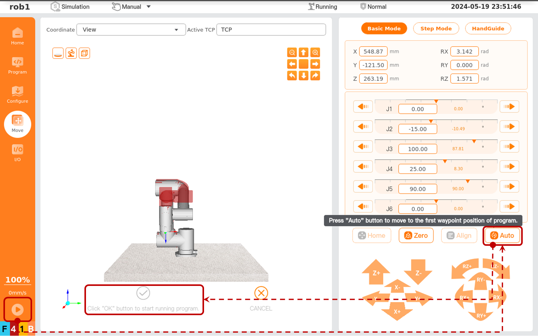 Click the [Run] button on the left menu bar, select [Run Program from Start Point] to enter the [Move] interface. Then press and hold [Auto] until this button is grayed out to move the robot arm to the start position of the program. At this time, click the [Confirm to Start Program] button to run the program, then the robot moves between [Waypoint_0] and [Waypoint_1].