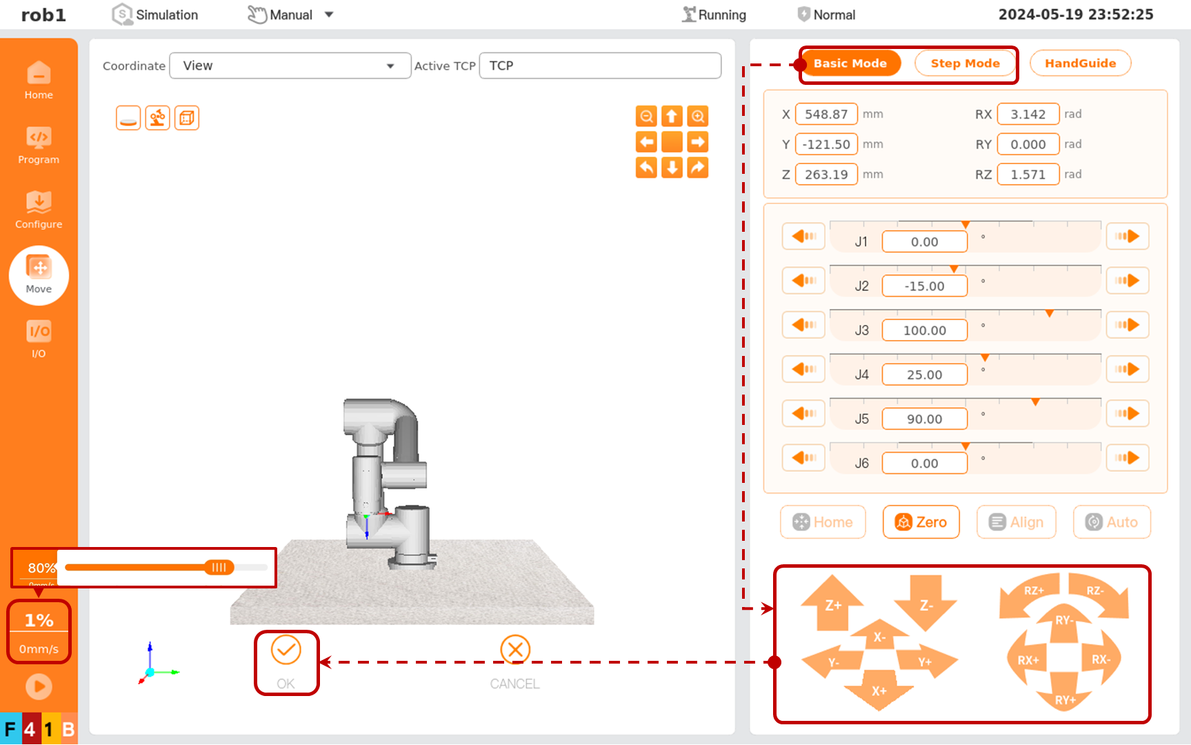 Users can select [Basic Mode] or [Step Mode]. Click [Position/Pose Control] to move the robot to the target position. After confirming the position, click [OK] to exit page [Move], ending the position/pose settings of [Waypoint _1].
