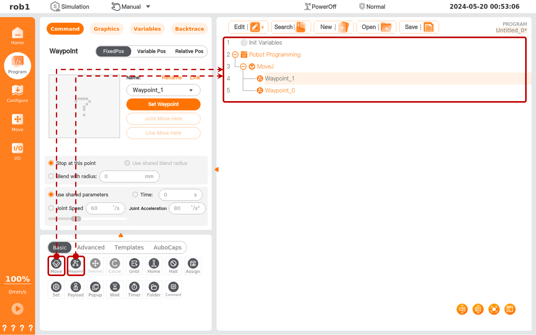 to add a [Waypoint] node to the program tree. Now the program has a [Move] node, and two waypoints under this node, namely [Waypoint _0] and [Waypoint _1].
