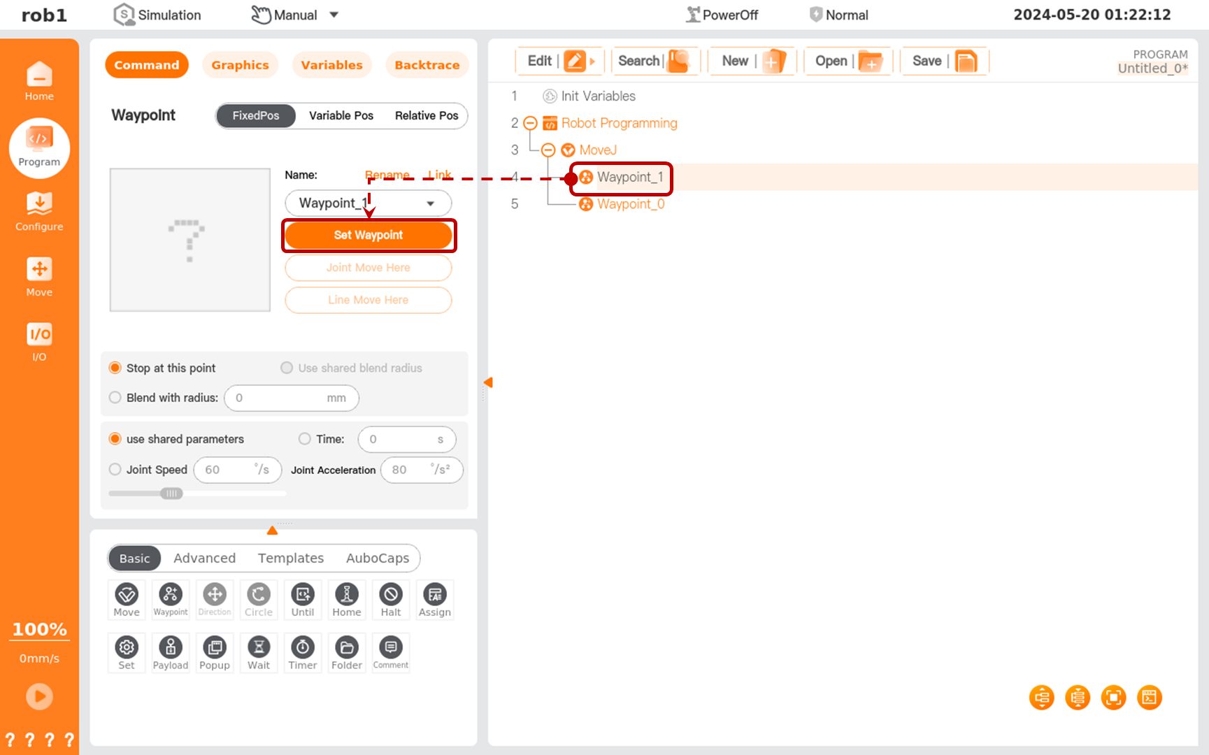 Click [Waypoint_1]. Then, click [Set Waypoint] under [Command] tab to enter page [Move].
