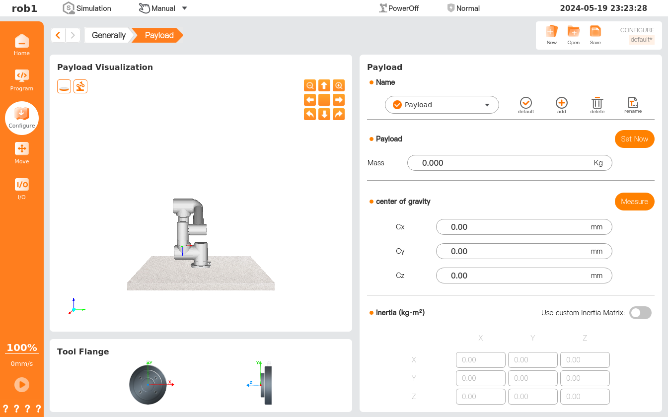 The [Payload] page allows defining or switching a payload. You can define more than one payload, at least one. Each payload must contain parameters such as load mass and CoG to maximize the performance of the robot.