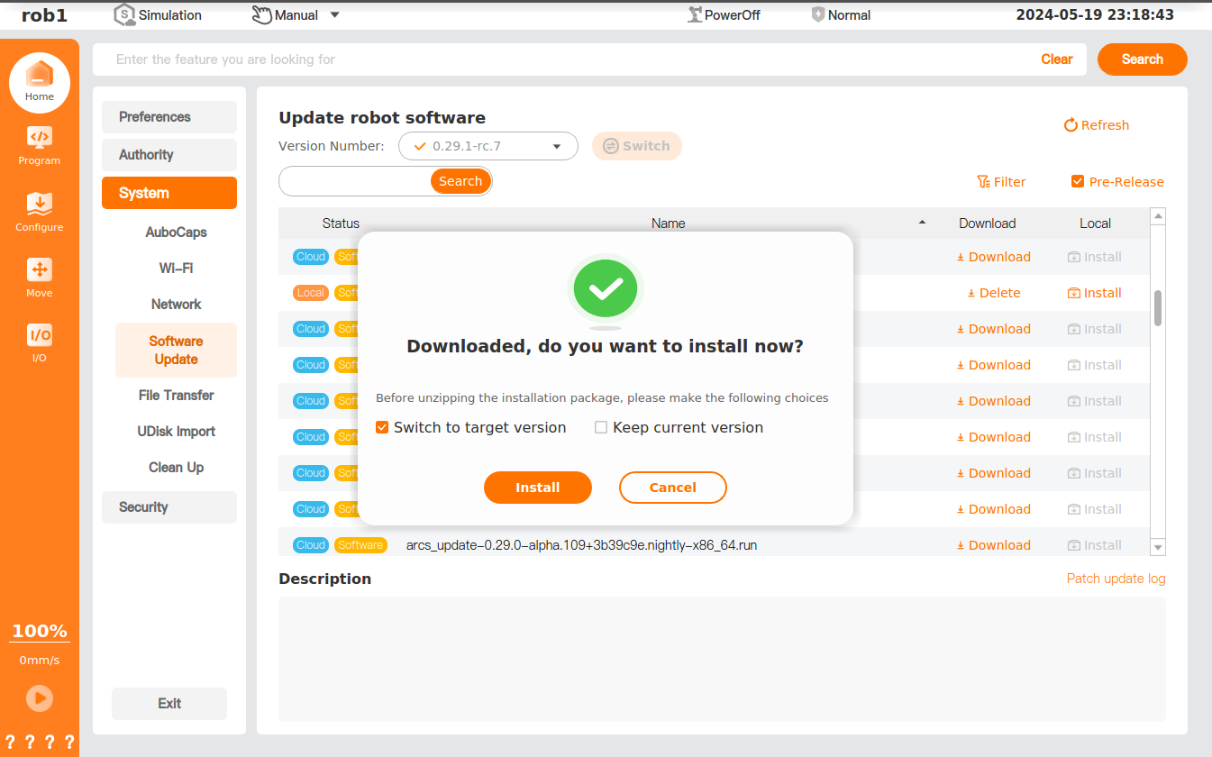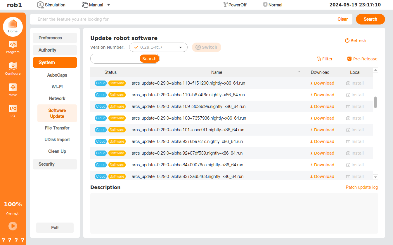 AuboStudio supports both online and offline software updates. For offline updates, first import the installation package into the controller, then access this interface for installation and upgrades.