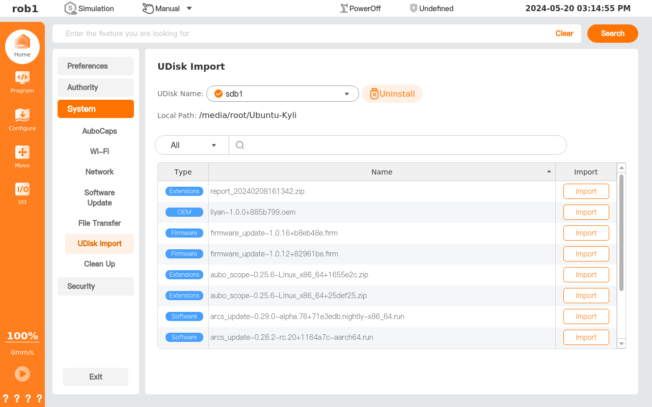 , it indicates that the U disk is mounted.Click [Import] corresponding to the file in the list to import the file into the controller.