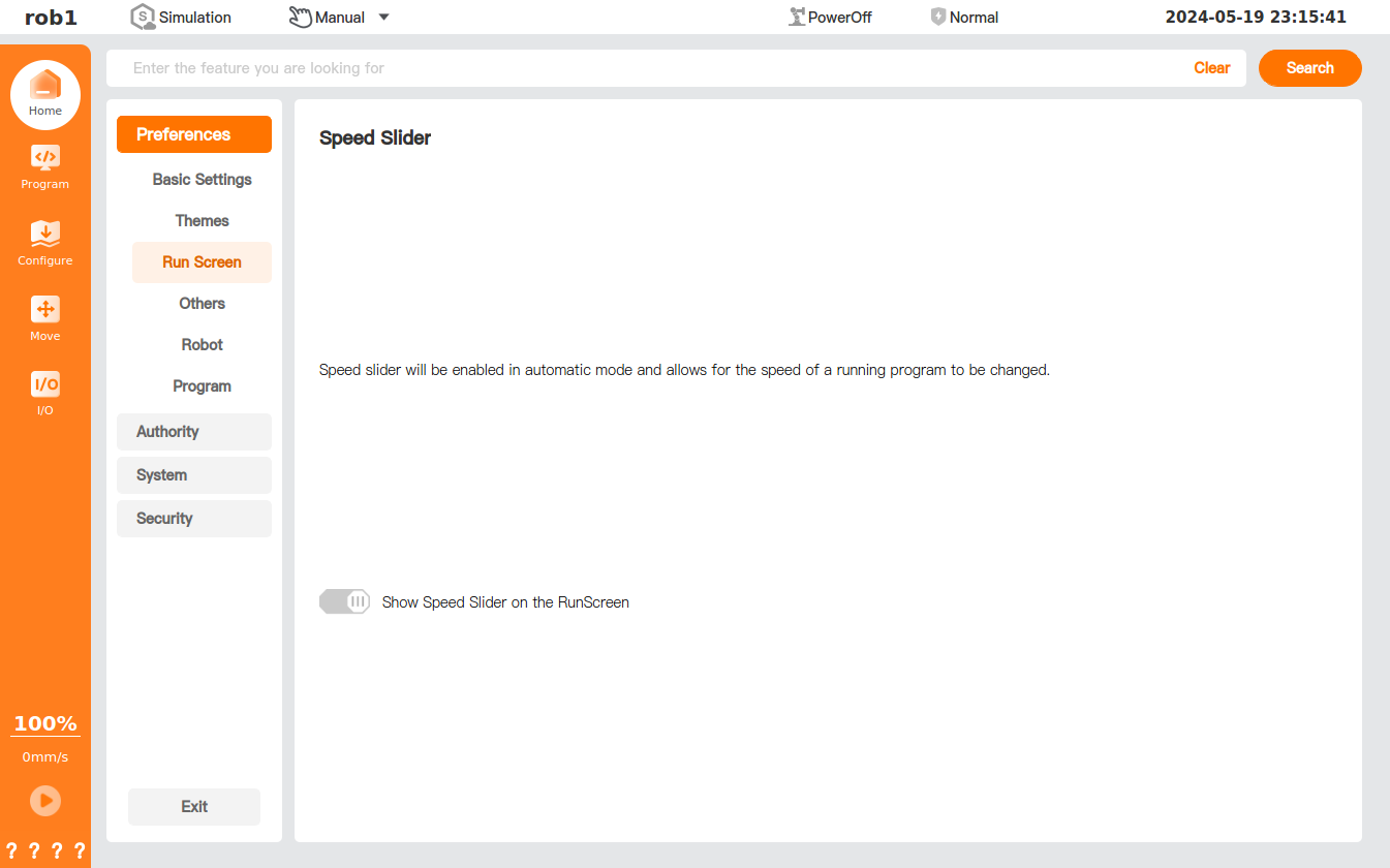 In the [Run Screen] page, you can turn on or off the movement speed slider of [Speed].
