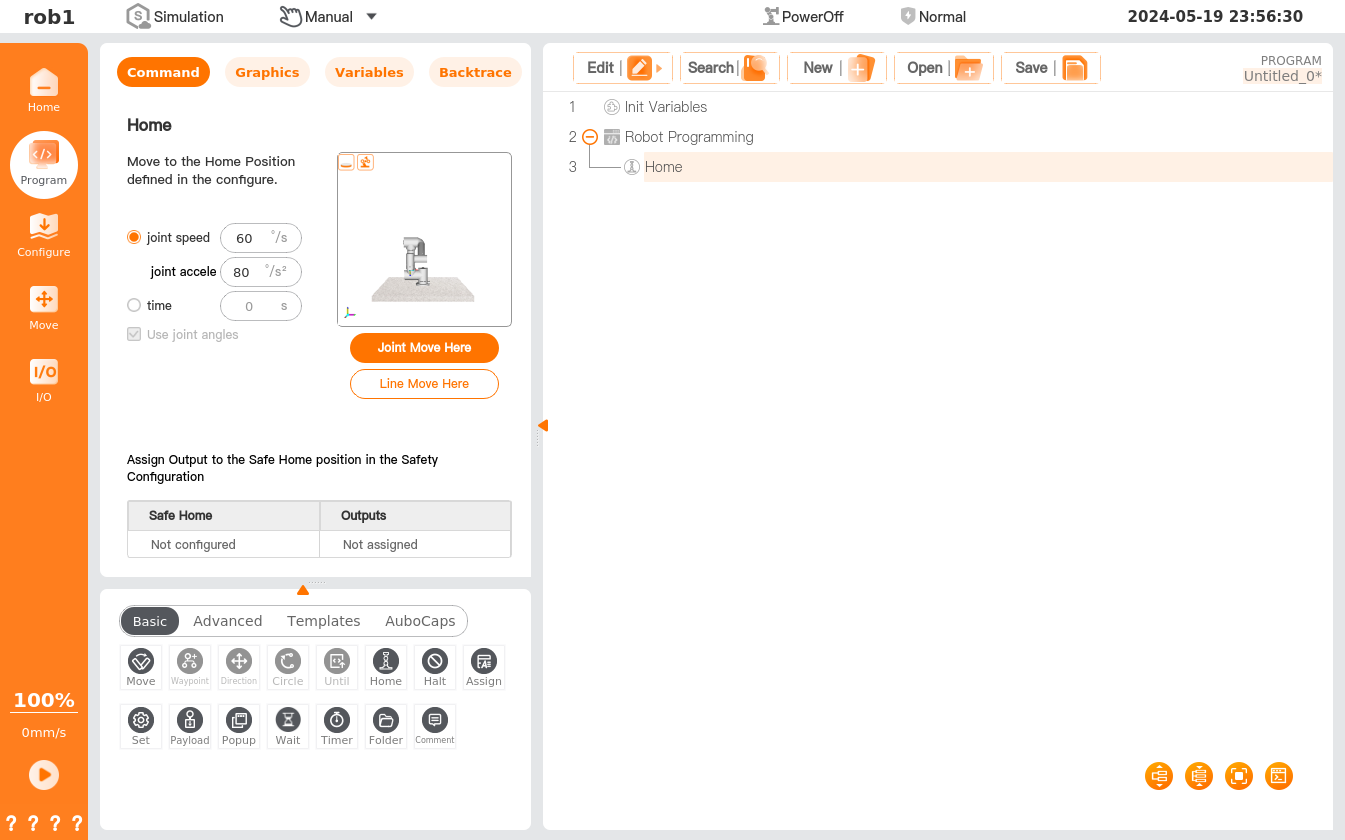 The [Home] command is designed to move the robot to the home node. Please refer to "Home" for position setting of the home node. If the corresponding safety I/O is set: when the robot moves to the Safe Home position and keeps stopping, the safety I/O will output a "1" signal; if the robot does not stop at the Safe Home position, the safety I/O output is "0." See "5.2.1 I/O" for the settings of safety I/O.