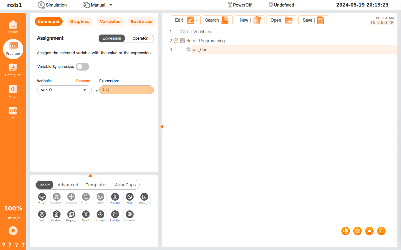 aand...are interpreted in turn, anda=0executes the variable assignment operation while...is added to the motion queue to wait for operation. Thena=1is interpreted while theINST[]algorithm is added. At this point,a=1does not immediately execute the assignment operation but is added to the motion queue to wait for execution, and1will be assigned toaonly when the motion queue runs to the instruction. Next, the system continues to interpretmoveJ(a). Becausea=1has not been processed in the motion queue, the value ofaobtained whenmoveJ(a)is interpreted will be0.