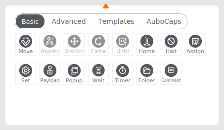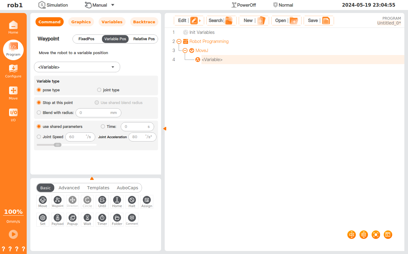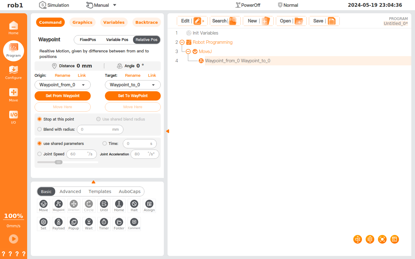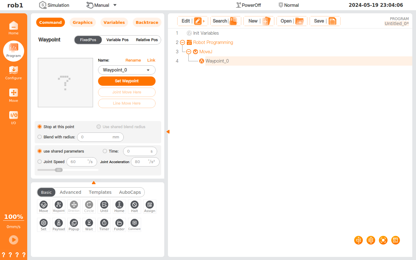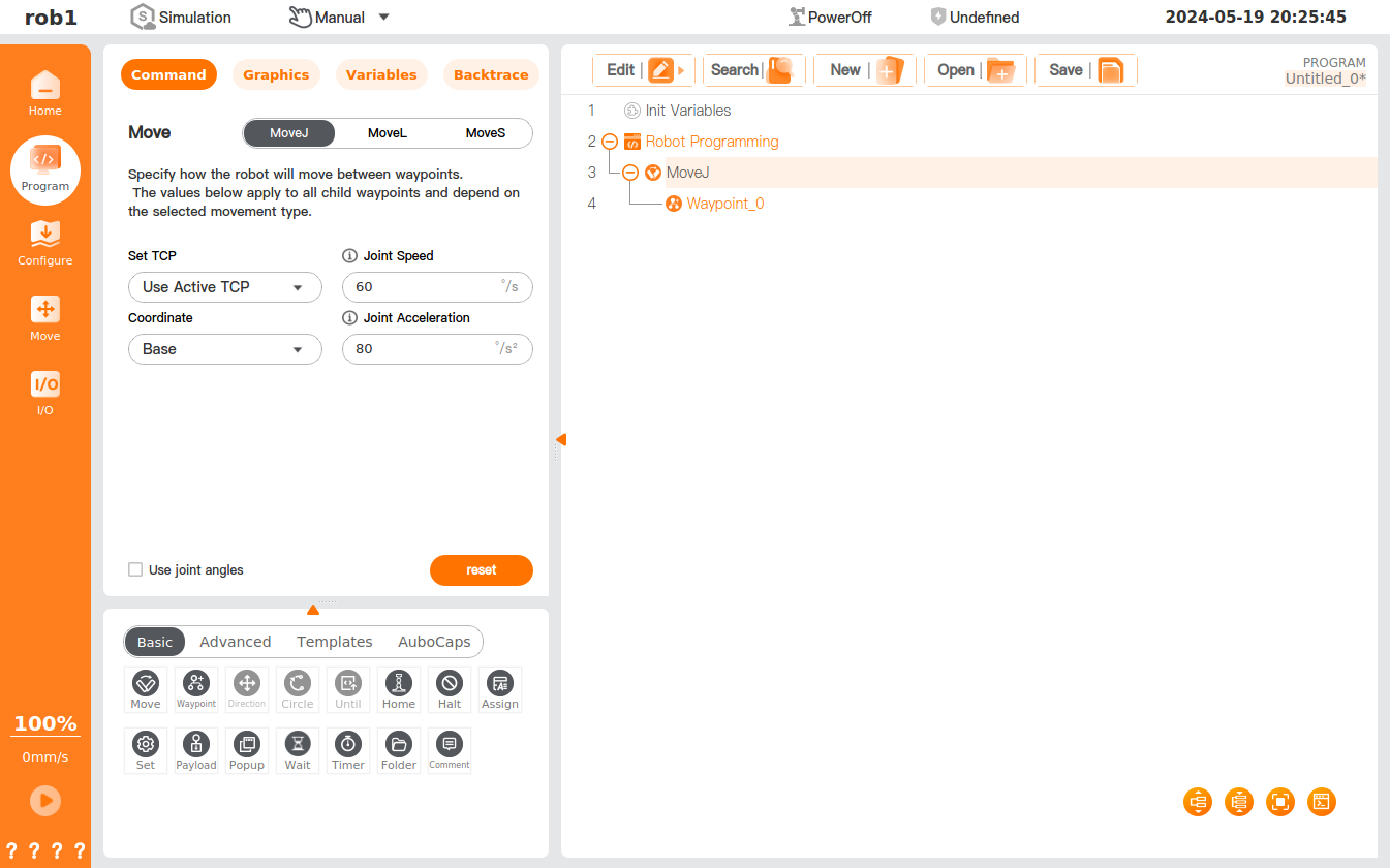 - Click the [Move] icon to add a [MoveJ] node to the program tree, including a [Waypoint] node beneath it.