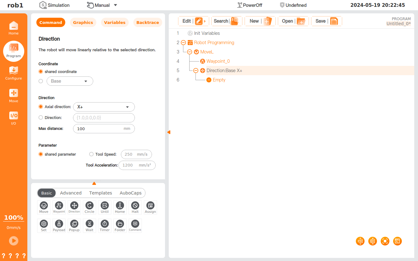 under the [Basic] program node to add the [Move] node to the program tree and set the [Move] node to [MoveL]. - Click [Direction]