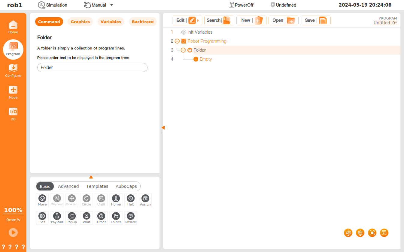 The [Folder] command is used to organize the program and allows you to add annotations to a program to enhance the clarity of the program tree, making it more readable and navigable. The folder has no effect on the program and its execution.