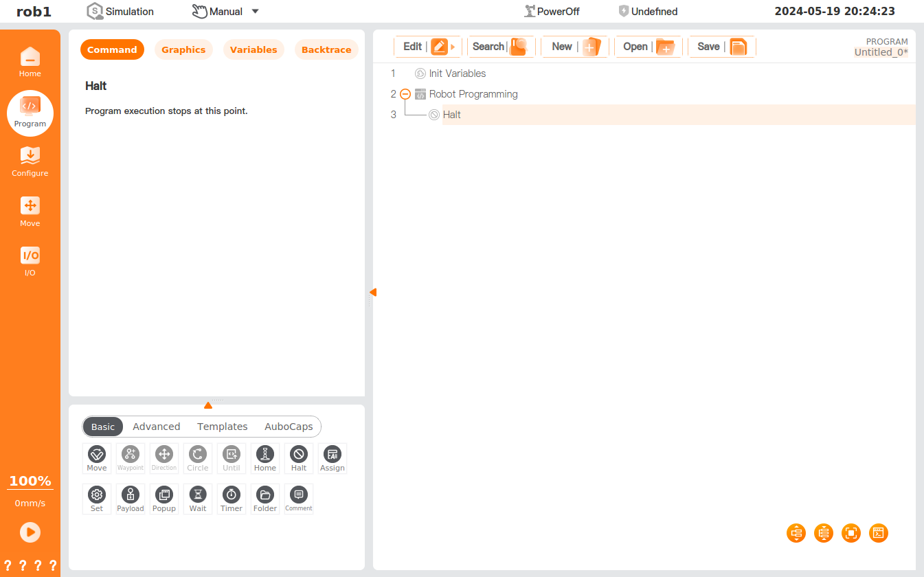 The [Halt] command is designed for stopping the program's execution. The program stops after reaching the [Halt] node.