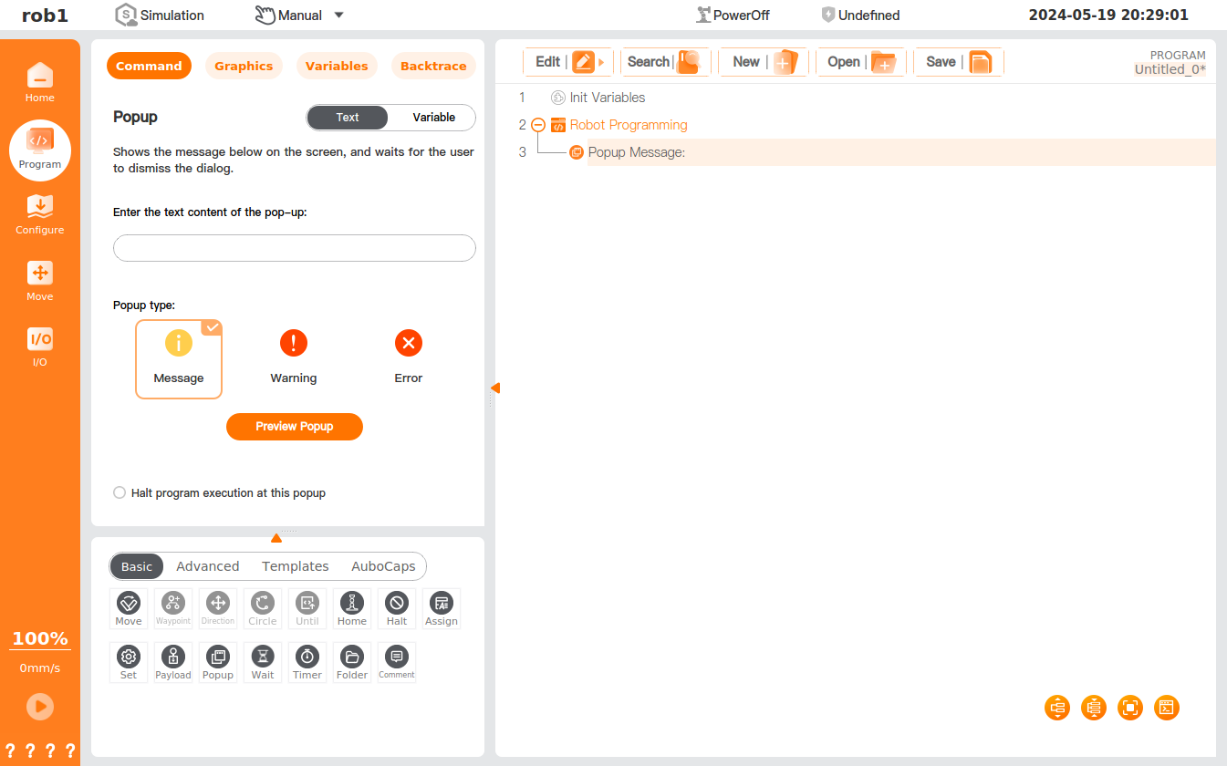 The [Popup] command allows you to specify a message, which will be displayed on the screen when the program runs to the node.