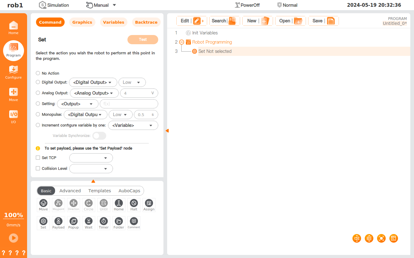 The [Set] command allows you to add the action you wish the robot to perform at this point in the program.