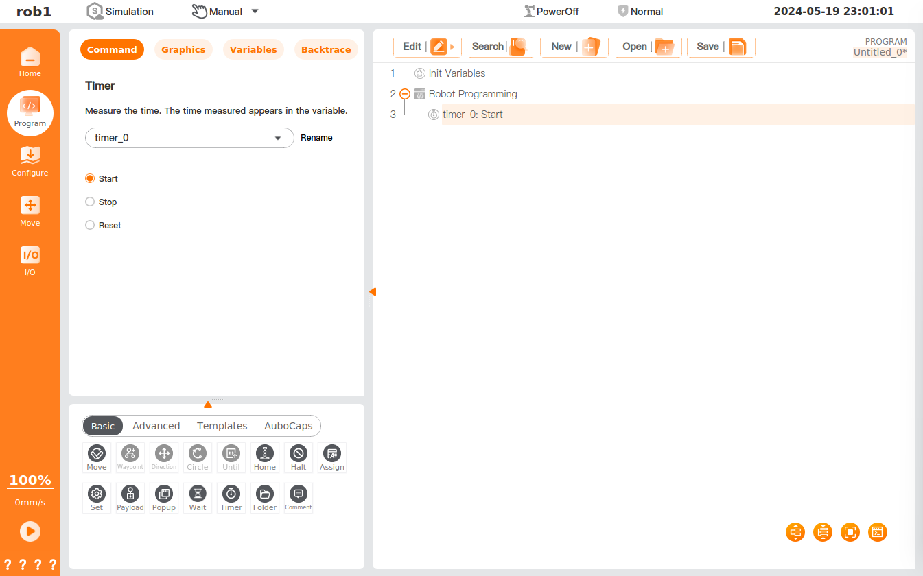 The [Timer] command is designed to record the execution time of the program, which will be displayed in the [Variable] interface.