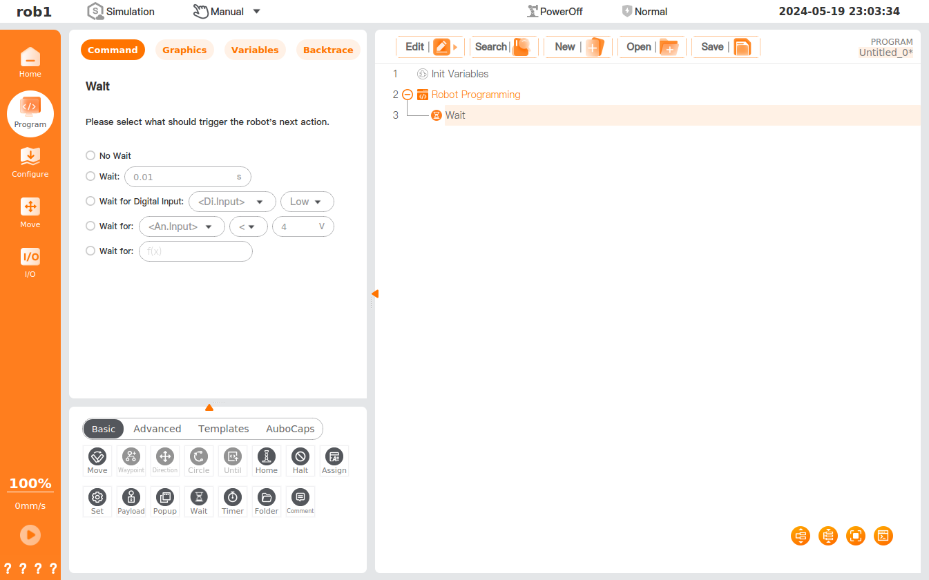- Wait: The robot is programmed to wait for the set duration before resumed operation.