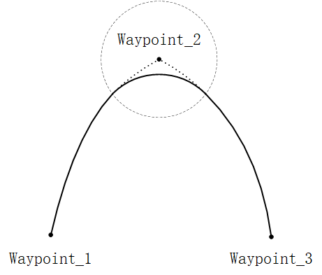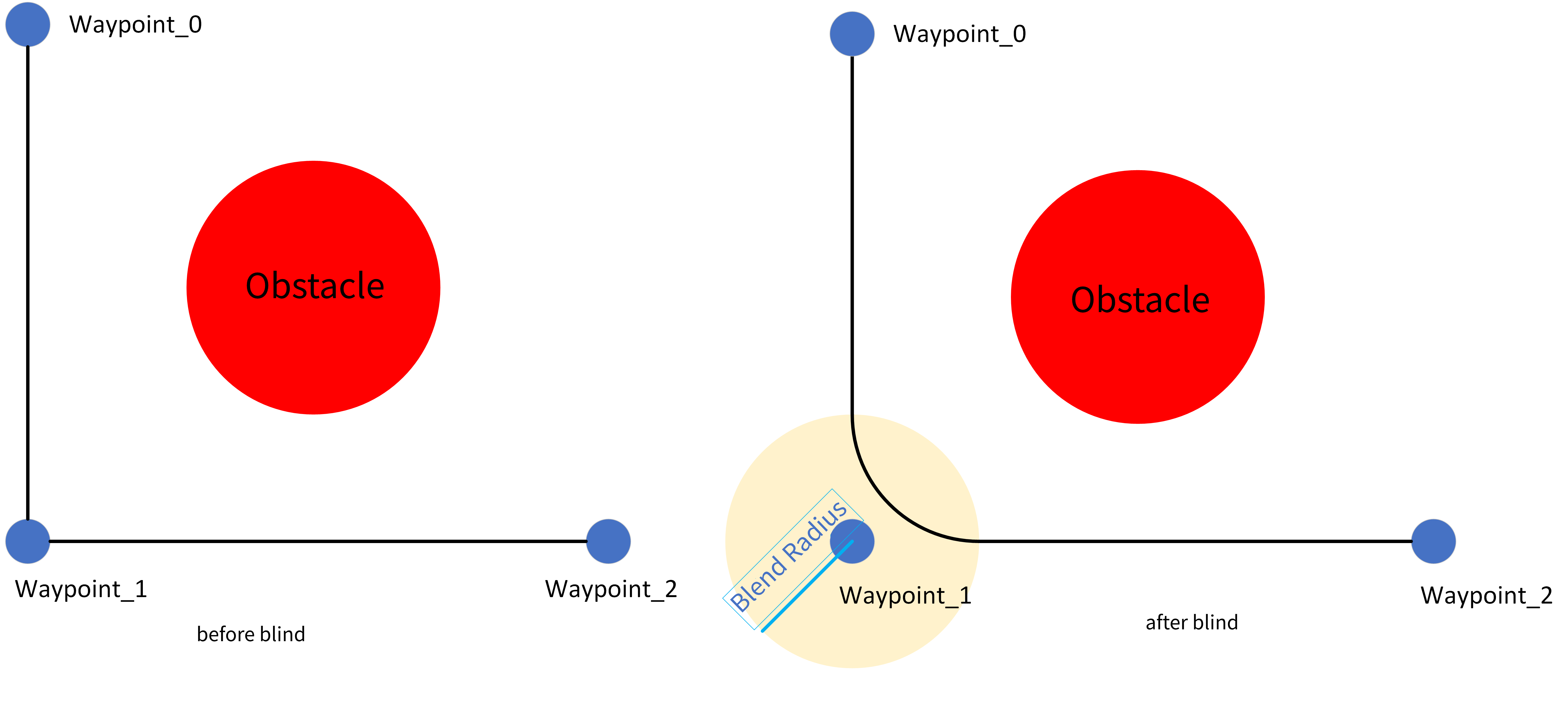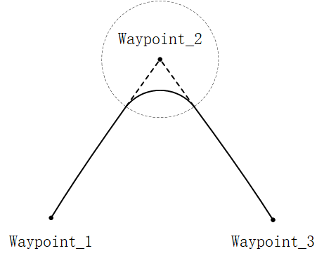 When the robot is moving, if you have set the blend parameters, a smooth transition between the two tracks can be achieved so that the robot can move faster and more stably. For example, in the following figure, the robot is expected to reach [Waypoint_2] from [Waypoint_0], but because there are other items between the two waypoints, the robot has to start from [Waypoint_0] and go through [Waypoint_1] to reach [Waypoint_2]. Since [Waypoint_1] only exists to bypass other items, it is preferable for the robot to expend minimal energy and time at [Waypoint_1]. At this time, adding the blend parameters will enable the robot to smoothly transition from the first track to the second track, eliminating the need for deceleration and acceleration at the intermediate point. This reduces the time and energy required for the robot to turn, thereby enhancing the movement efficiency.
