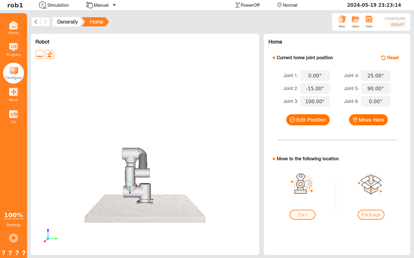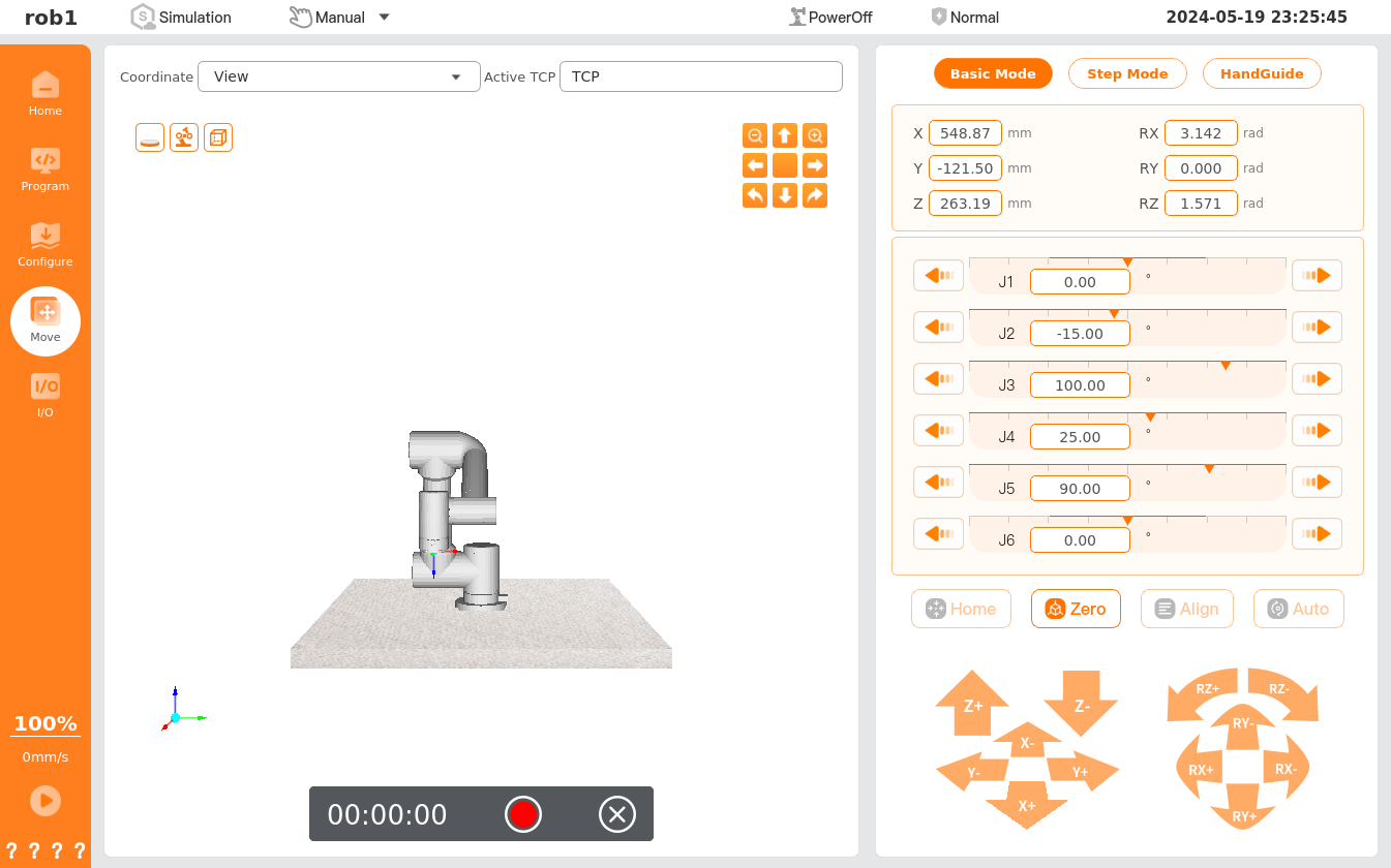 - Zero: Move the robot quickly to the zero position/pose.