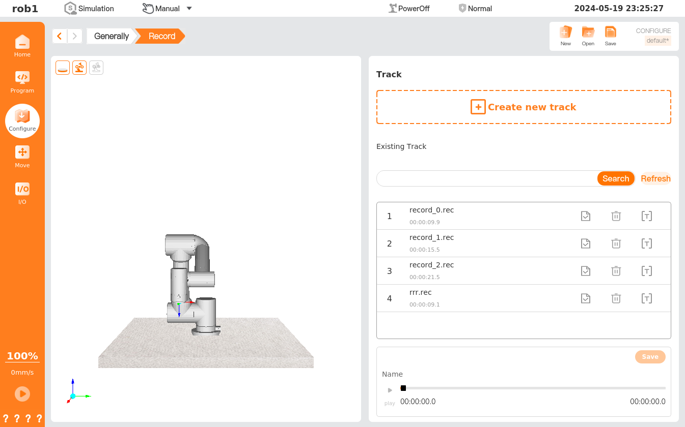 to start recording. Control the robot using the position/pose control button. The system will record the robot's track and time. Click