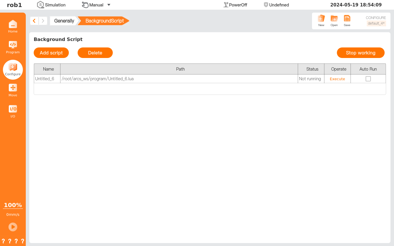 [Start] allows setting of the default program and auto initialization. A default program is a program loaded automatically upon boot of the controller, which is loaded automatically when the system starts running without loading any programs. Auto initialization, i.e., when the robot receives an initialization signal in the power-off state, it will start initialization to restore to the operable status.