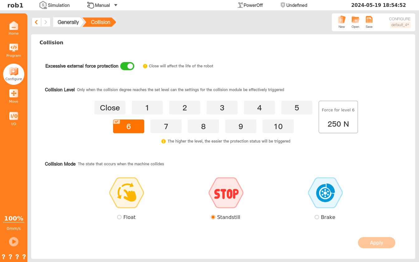 The robot features 10 safety levels that determine the sensitivity of the robot when a collision event is triggered. The lower the value, the higher the safety level, and the more force needed to trigger the collision event. The system default collision level is Level 6.
