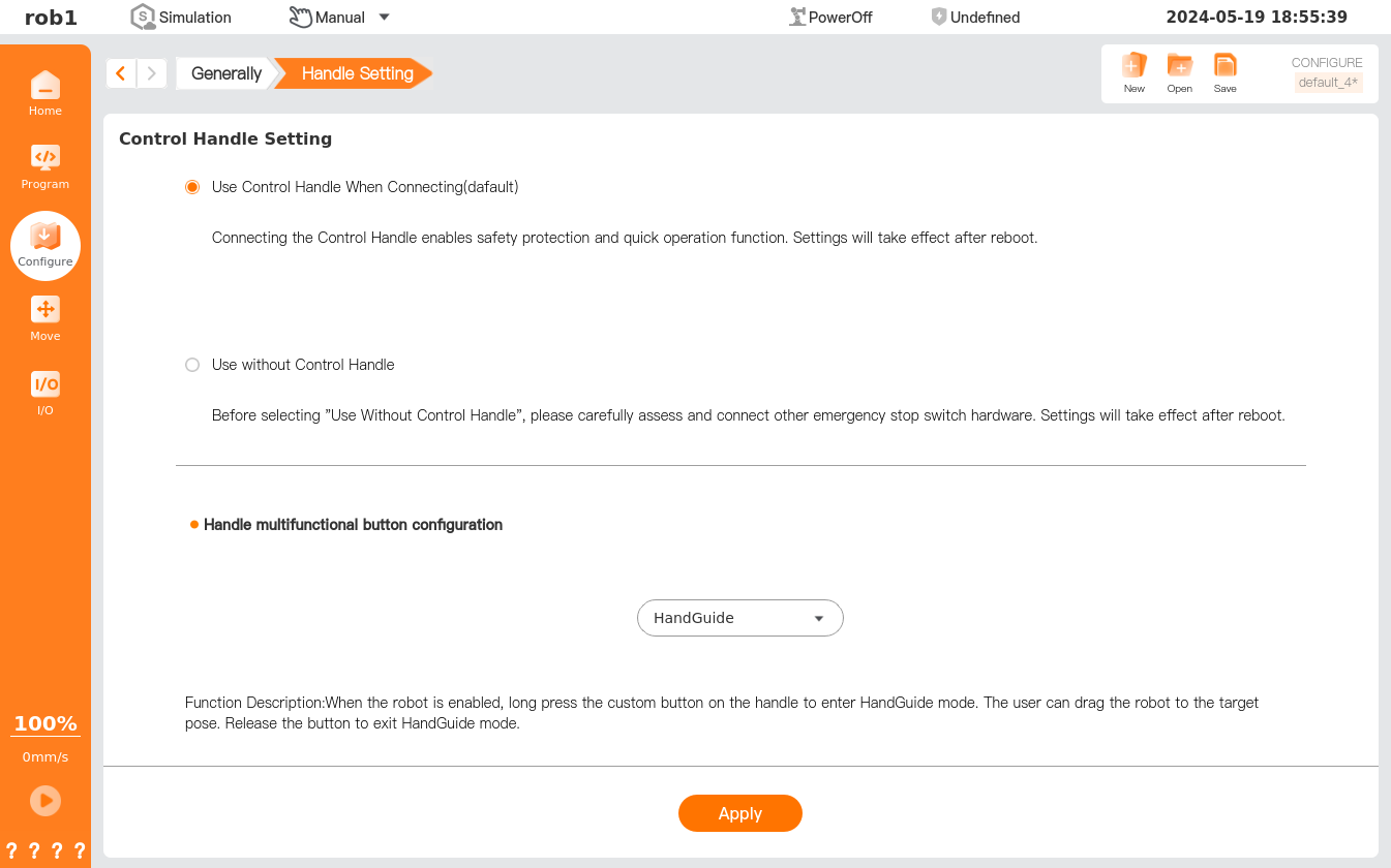 Clicking [Apply] will only make the handle settings effective temporarily. To ensure that the relevant settings can be found upon restart, click [Save] to save the current installation profile.
