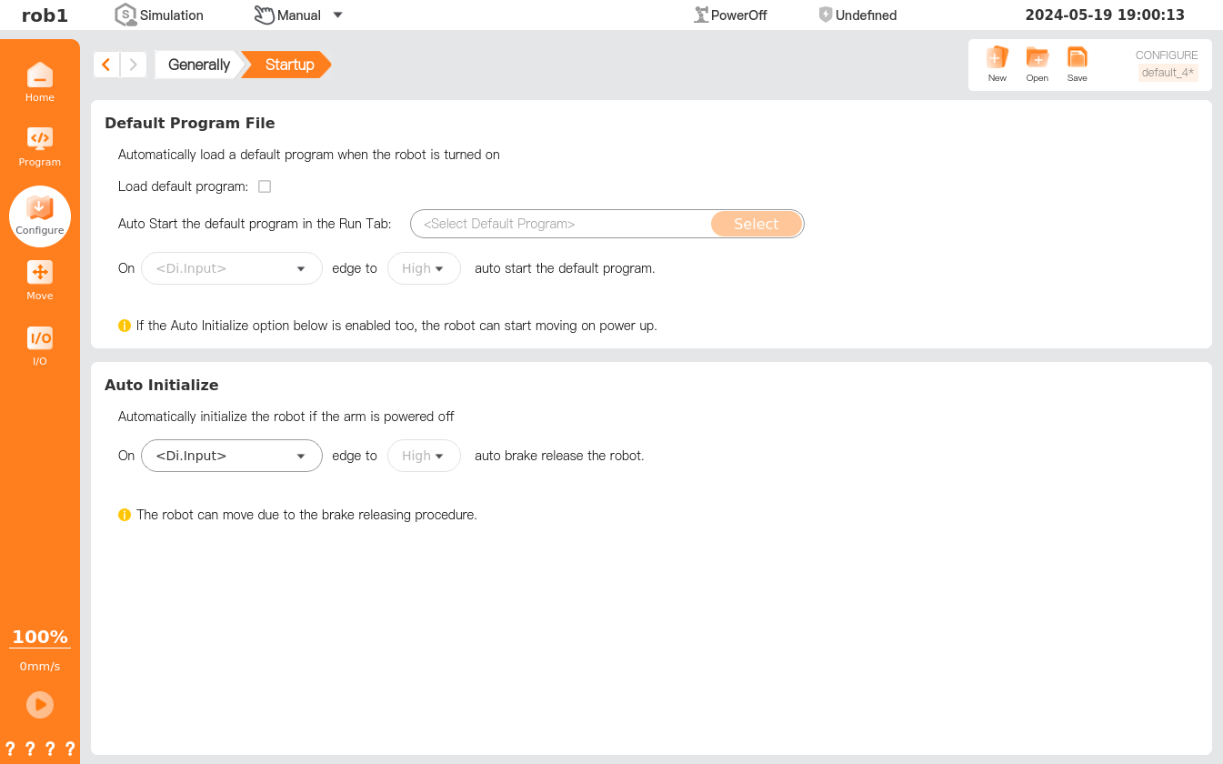 - When automatic robot connection, automatic power-on, and automatic loading are enabled, the robot runs the program immediately after the controller is powered on, provided that the input signal matches the selected signal level. For example, in the case of low level, it is no need to transit an edge level to the selected signal level.