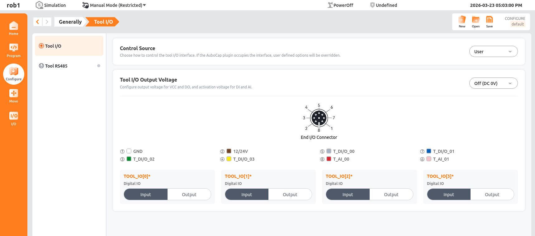 - TOOL_IO[0] ~ TOOL_IO[3]: Set the communication direction of the tool's digital I/O.