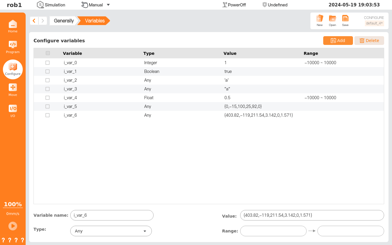 - Configure variables: Such variables can be applied to more than one program, and their names and values persist until the robot is decommissioned. Therefore, they are persistent variables.