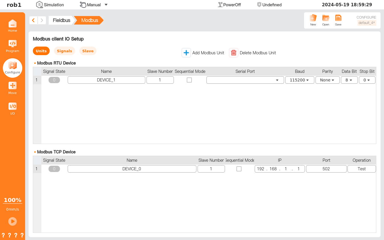 - Click "Configure > Fieldbus > Modbus > Units." Click [Add Modbus Unit], select the Modbus unit mode, customize the device name and slave number, and set the relevant parameters of the Modbus device.