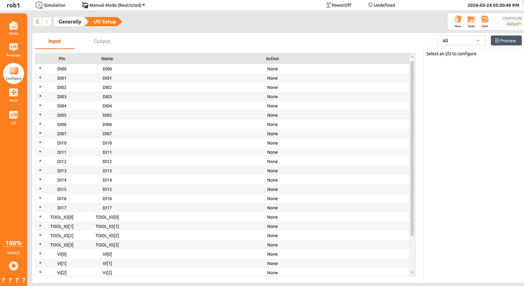 [Configuration > I/O Settings] allows you to configure the functions of the I/O ports available to users, including the digital I/O port, analog I/O port, and tool I/O port. For some controller models, safety I/O ports can be used as general I/O ports when they are not assigned with any value. Please refer to the Hardware User Manual for details.