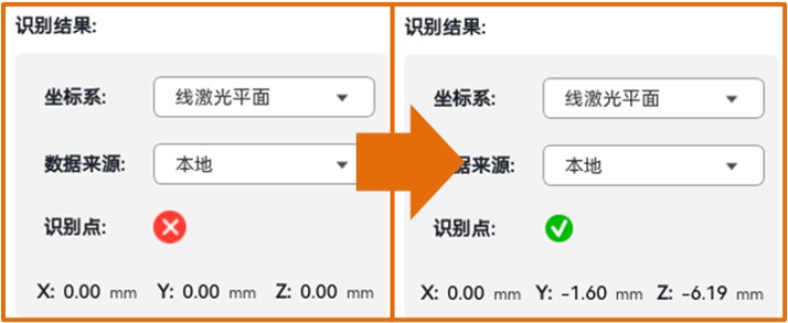 将激光照射在需要识别焊缝表面且使相机能识别光条,设置设置好job号与传感器位置后,传感器识别到特征点识别结果如下所示。