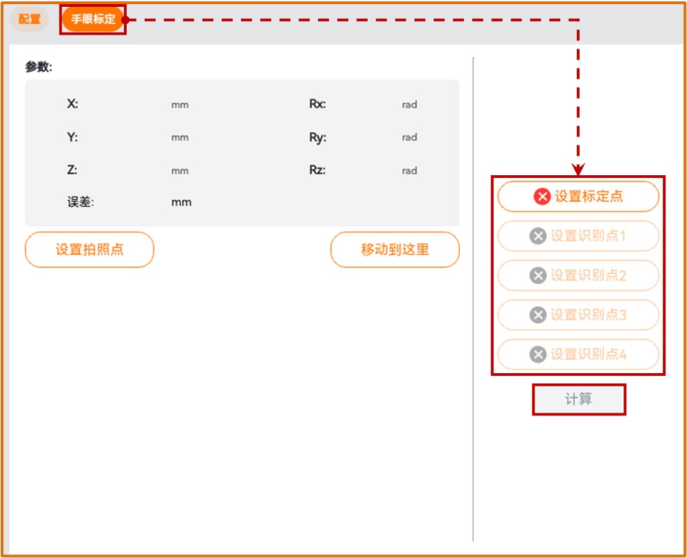 点击【手眼标定】进入如下界面,首先设置标定点,将TCP末端执行器尖端触碰标定点如a所示,然后机械臂用四组不同的位姿使得传感器激光照射在标定点上并识别到标定点,如bcde所示。设置好标定点和识别点后,点击【计算】手眼标定完成。