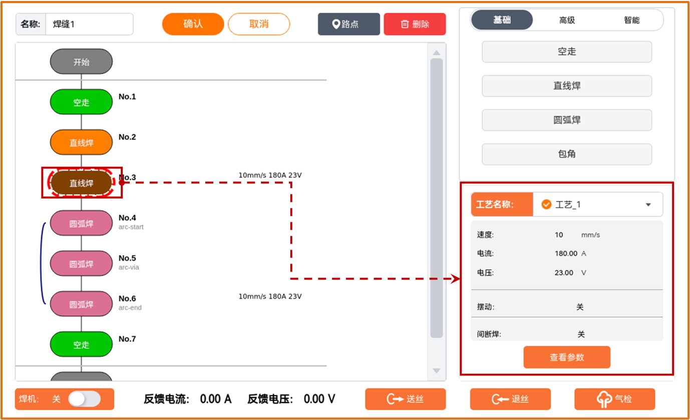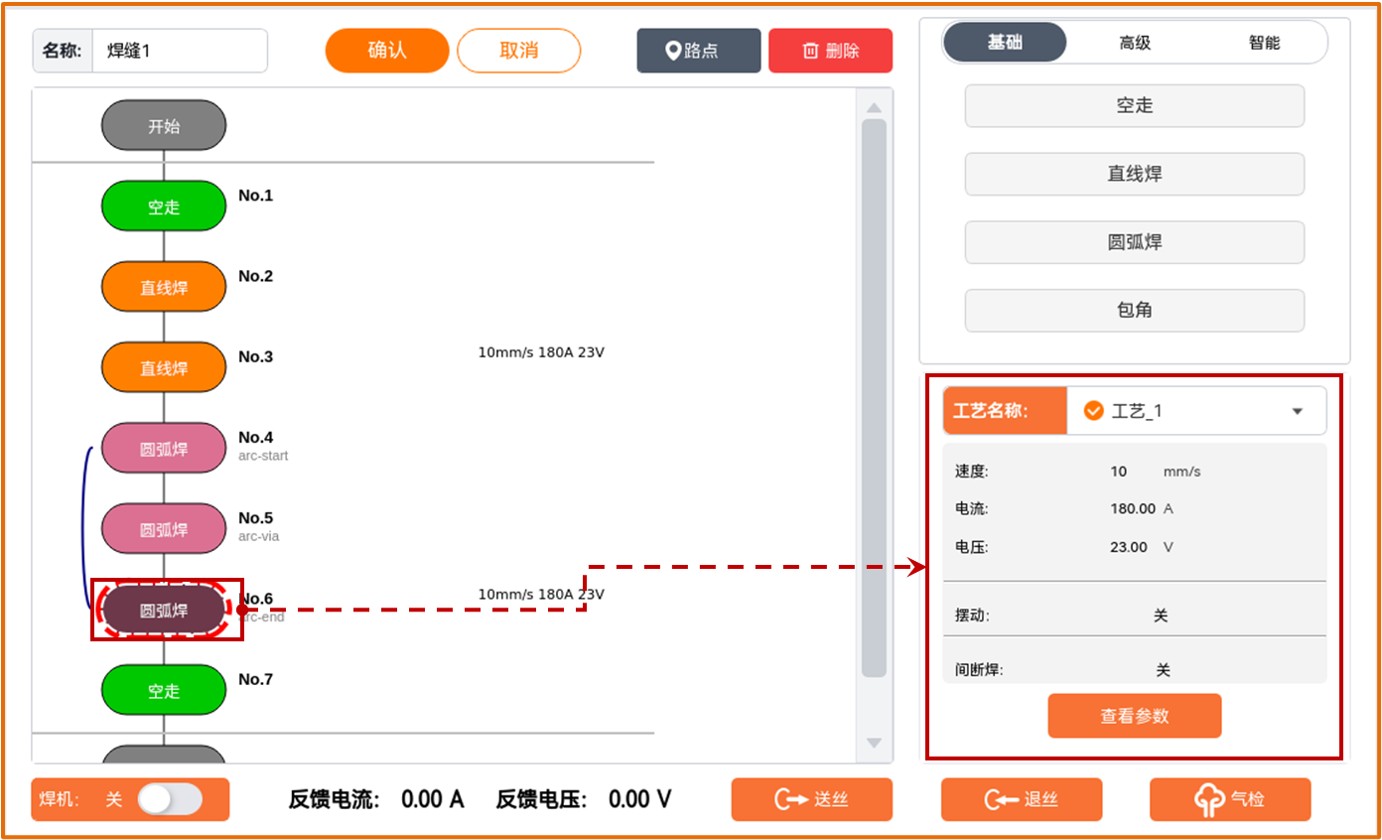 - 焊接工艺参数:是执行焊接动作时设置的机器人的运行速度和焊机的工作电流、电压等工艺参数;