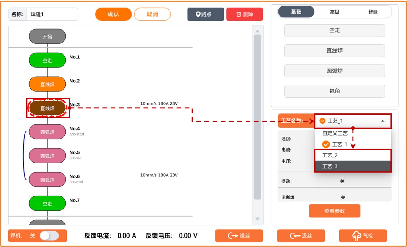 焊缝可以配置两种类型的焊接工艺参数,一种是在焊接配置界面设置完成的全局焊接工艺参数,该类型工艺参数可以被不同焊缝使用,具体配置方法参考章节6.2.2。另一种是可针对每条焊缝单独配置的“自定义工艺”参数,该工艺参数只能被当前焊缝单独使用。