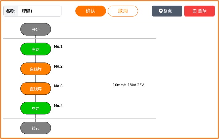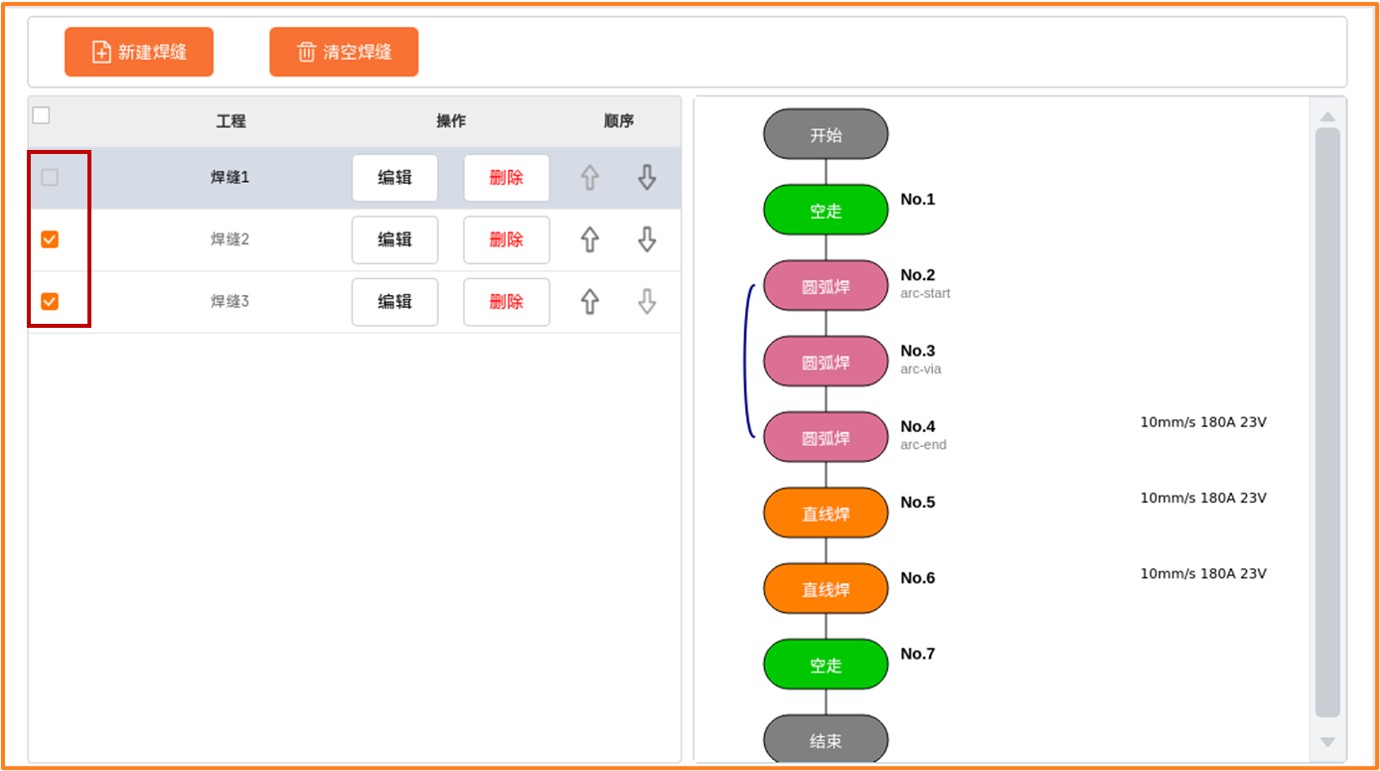 一个焊接工程中可以包含多条焊缝,焊缝前的单选框只有被勾选时,该条焊缝才会在程序启动时被运行。如果有多条焊缝被勾选,那么会按顺序运行被勾选的焊缝。