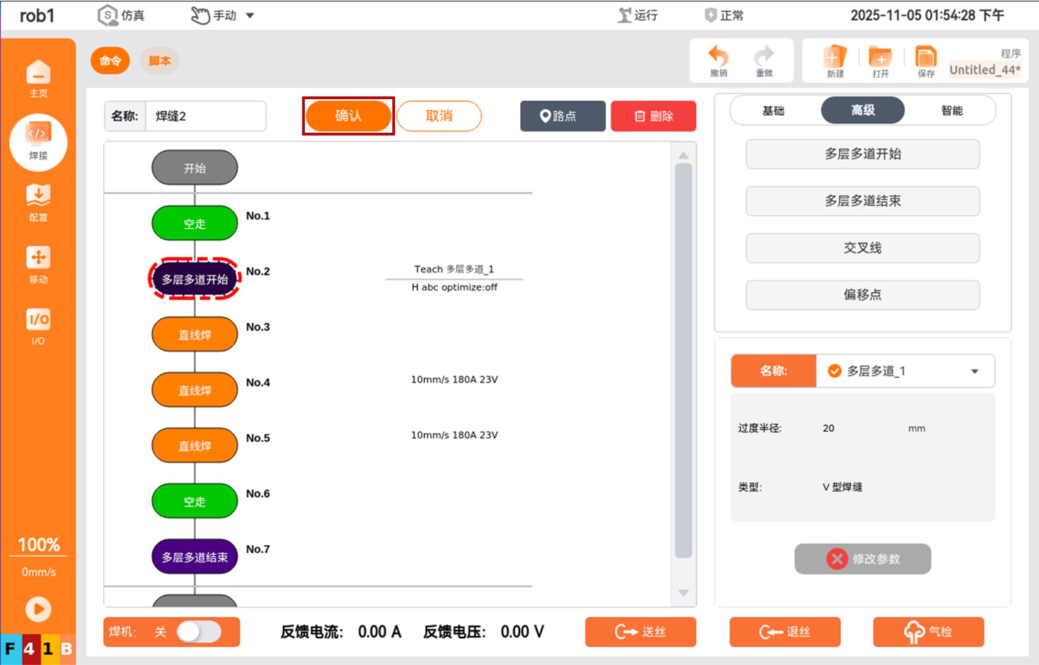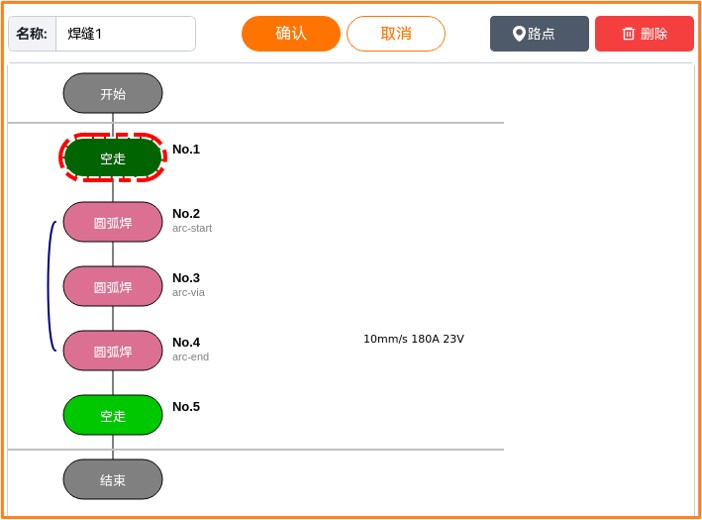 当焊接工程建立好以后,可以通过原轨迹模拟和快速模拟来检查机械臂是否按照用户预期的轨迹运行。首先点击【确认】,使焊接工程生效。(不点确认焊接工程不会生效)