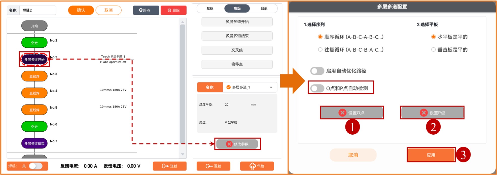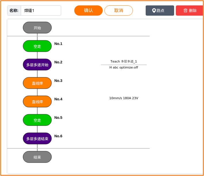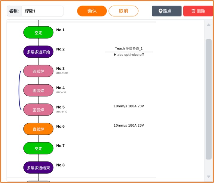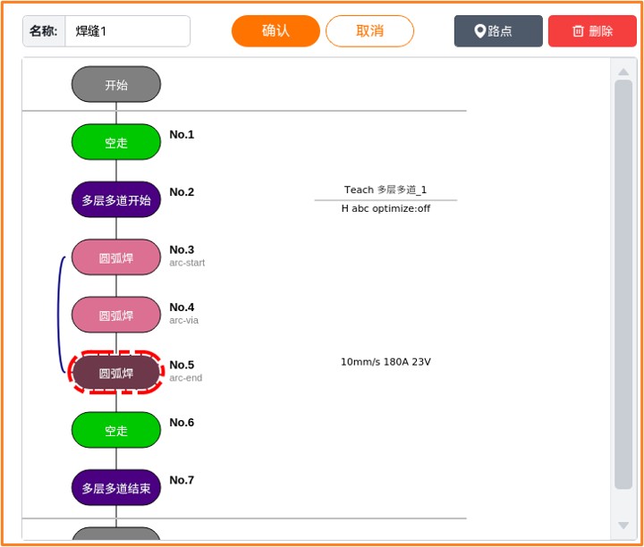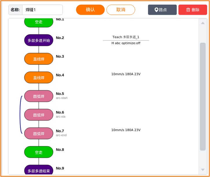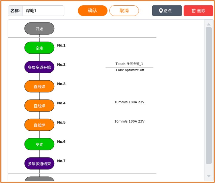 多层多道结束:焊缝执行多层多道的结束指令。多层多道结束点前必须添加避障点。