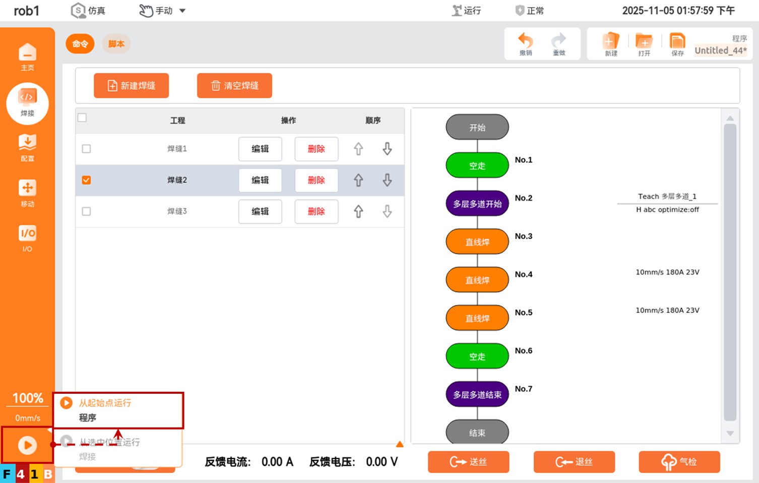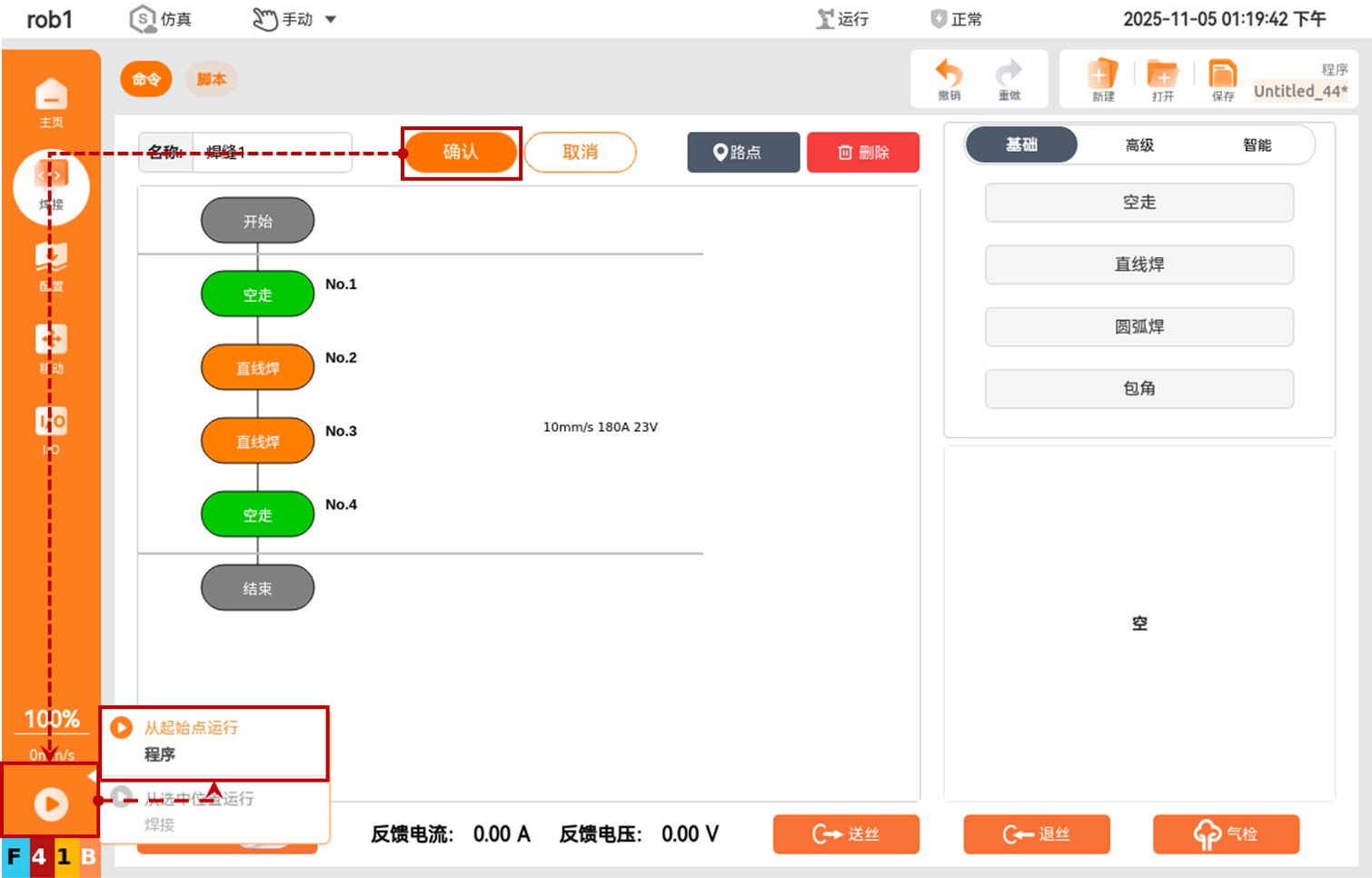 工程编辑好后,依次点击【确认 > 开始运行> 从起始点运行程序】按钮即可运行焊缝。