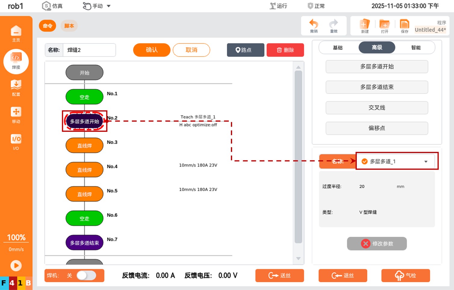 点击【多层多道开始】节点指令,右下角会弹出参数设置框,在【名称】下拉框中选择配置完成的多层多道工艺参数名称,即可完成参数配置。