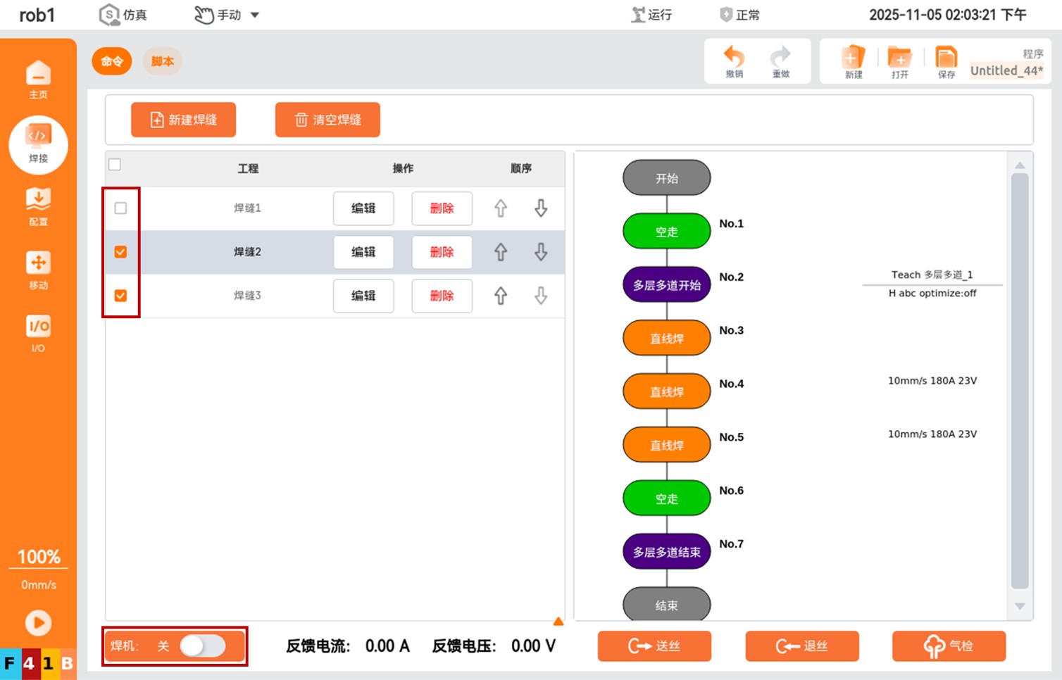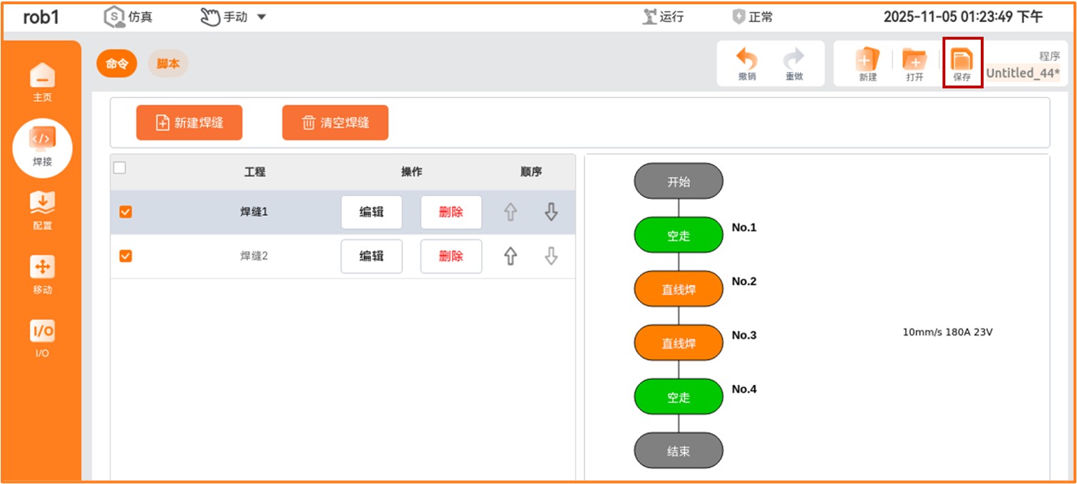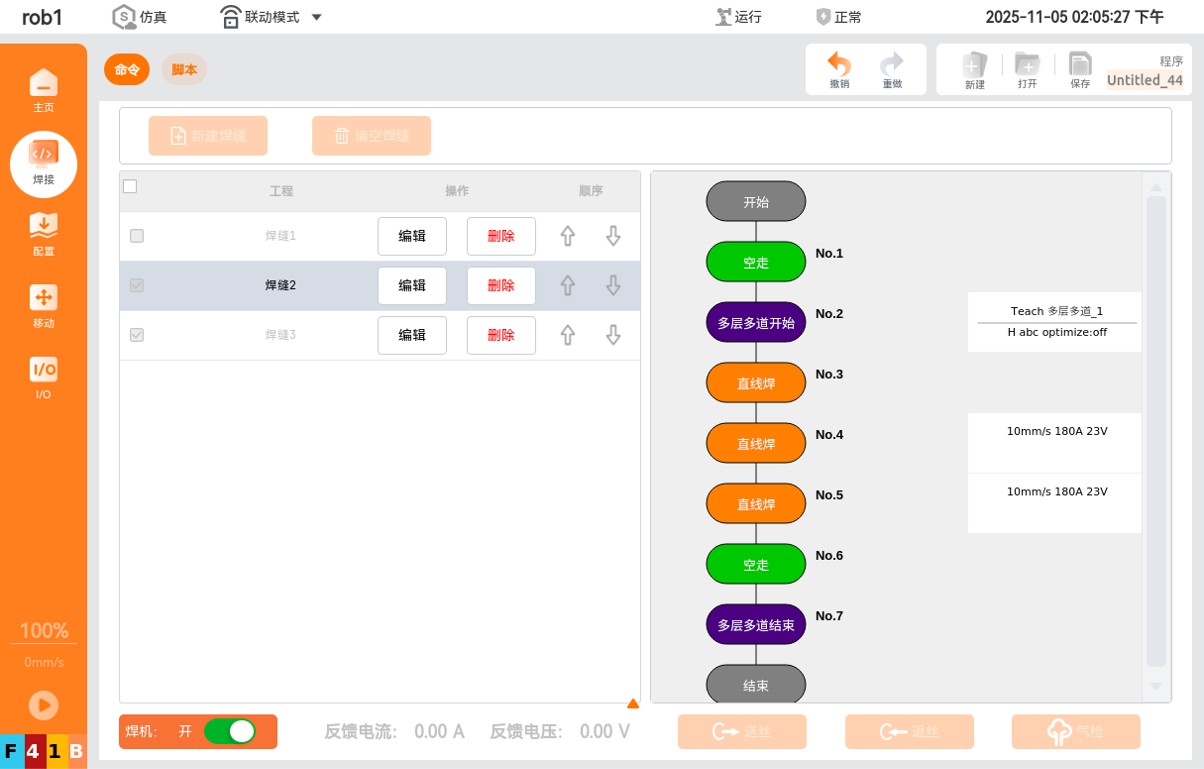 当用户创建好焊缝程序以后,勾选上相应的焊缝,将焊机开关打开。