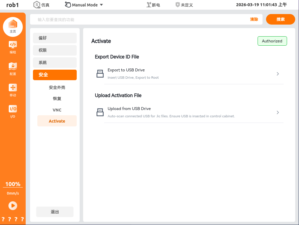 .lic)。Upload Activation File 自动扫描插入控制柜的 U 盘(需提前将